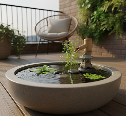 Jika Anda menginginkan elemen relaksasi tambahan, miniatur kolam atau air mancur kecil bisa menjadi pilihan. Suara gemericik air dapat menciptakan suasana tenang dan menyegarkan. Anda bisa menempatkan beberapa tanaman air kecil di dalamnya.